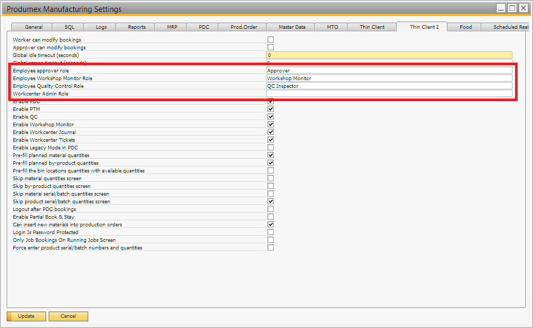 - Produmex Manufacturing Settings > Thin client 2 tab