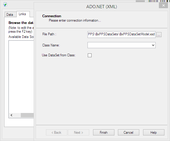 Define the file path to the BX PPS Data Set Model by clicking on the ‘Links’ tab. Browse the BxPPSDataSetModel.xsd file after clicking on the ‘…’ button on the ‘ADO.NET form. Then click on ‘Finish’.
