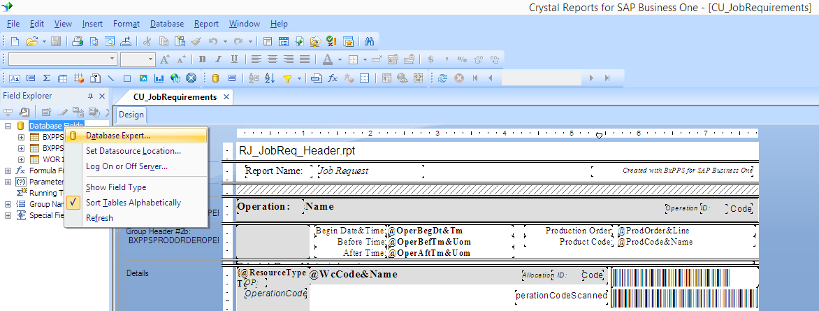 After the layout has been opened in Crystal Reports, setup the ODBC connection between the report and the database. On the Field Explorer right click on ‘Database Fields’ and select ‘Database Expert’ option.