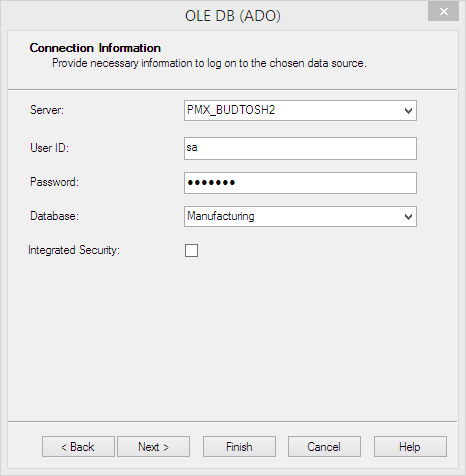 On the next screen add the connection information. Select the local server as the ‘Server’ and enter the User ID and Password. Then select the database from the dropdown menu and click on ‘Next’.
