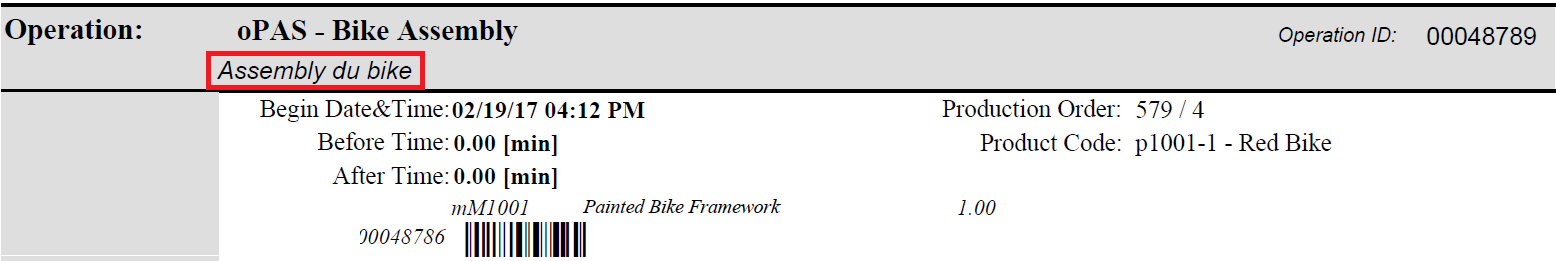 When you print the custom report created in the example, the foreign name will be added under the operation name.