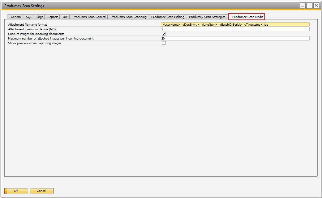 An additional setting for the image capturing called Produmex Scan Media is available on the Add-On’s Settings screen.