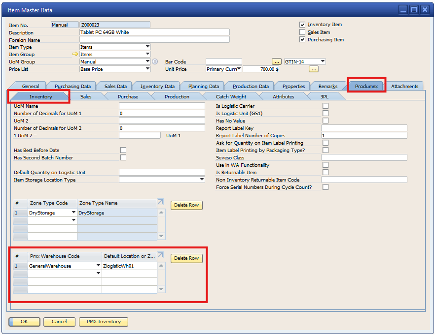 1.4. Item Master Data: Produmex tab