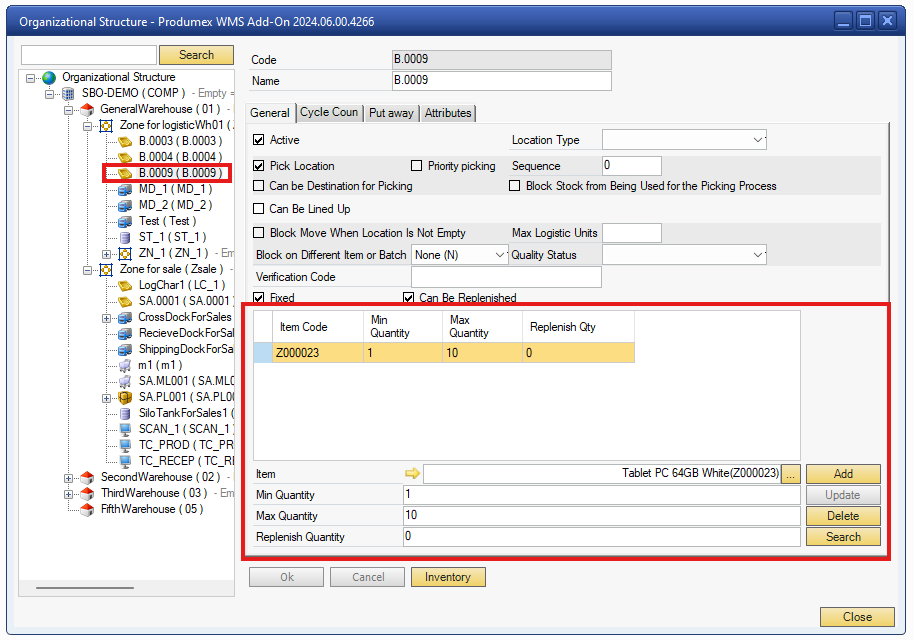 Produmex WMS extends the standard functions of SAP Business One with concepts that are important for the operational management of items, for example Best Before Date and location code.