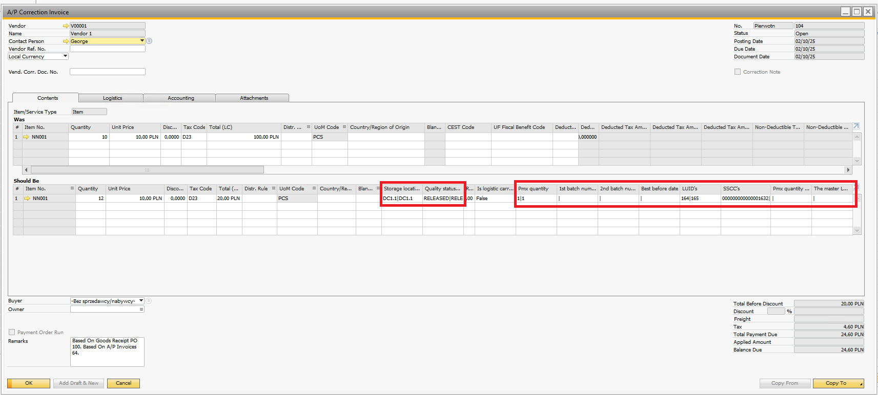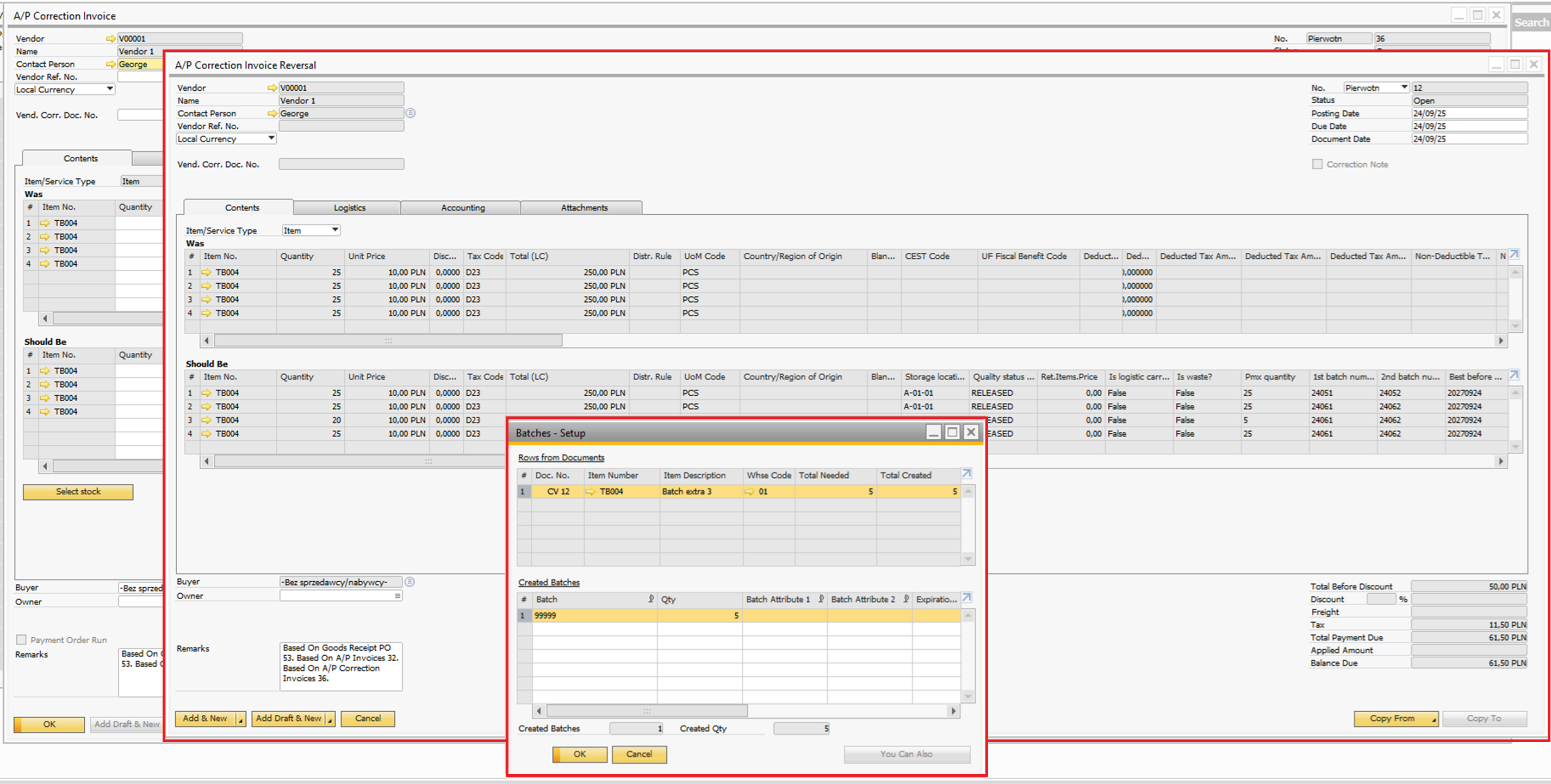 When adding a Correction Invoice Reversal, the standard SAP batch/serial selection window always appears. In receipt direction (when goods are returned to inventory), SAP allows users to select a different batch than the one used in the original Correction Invoice.